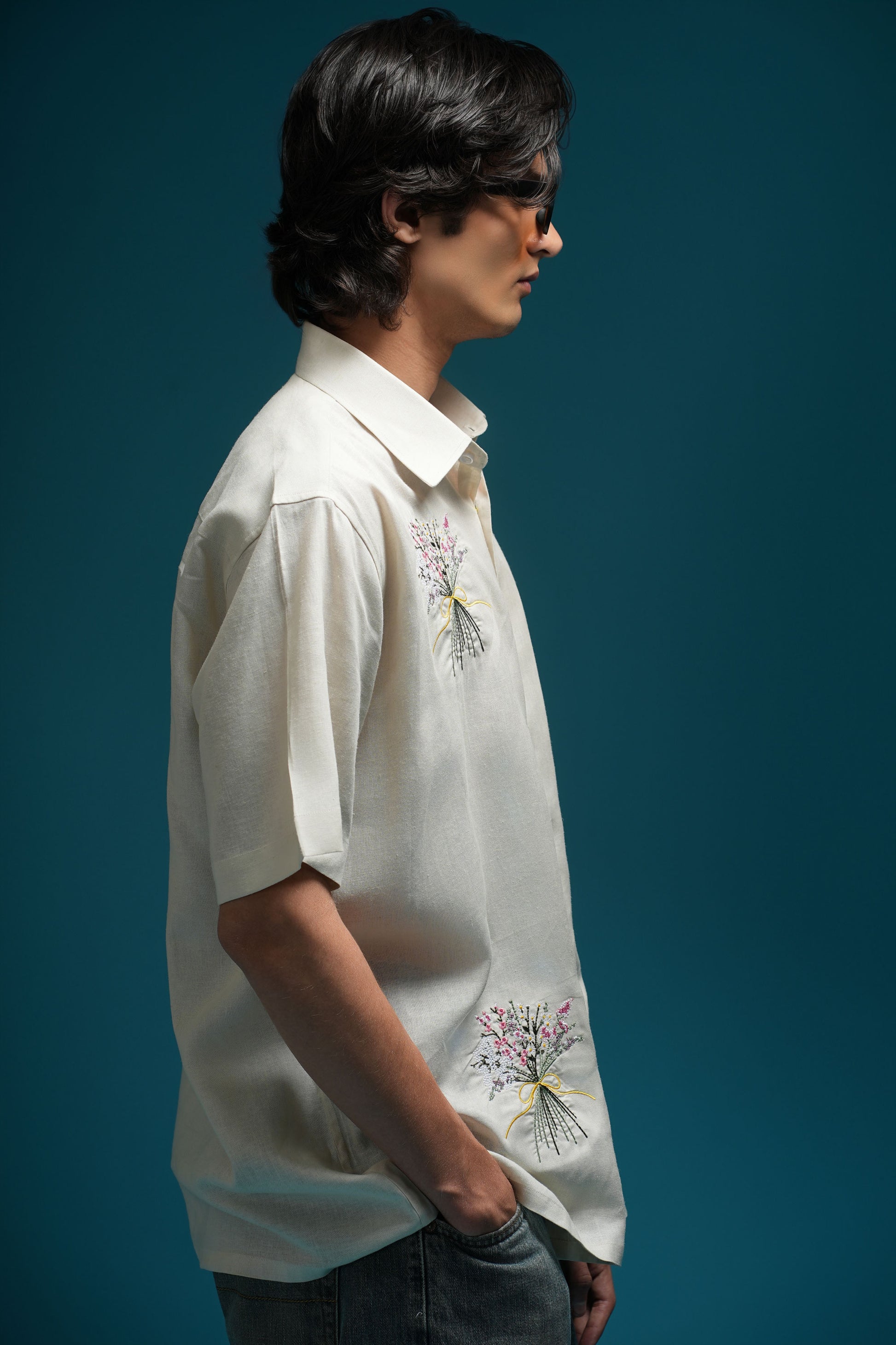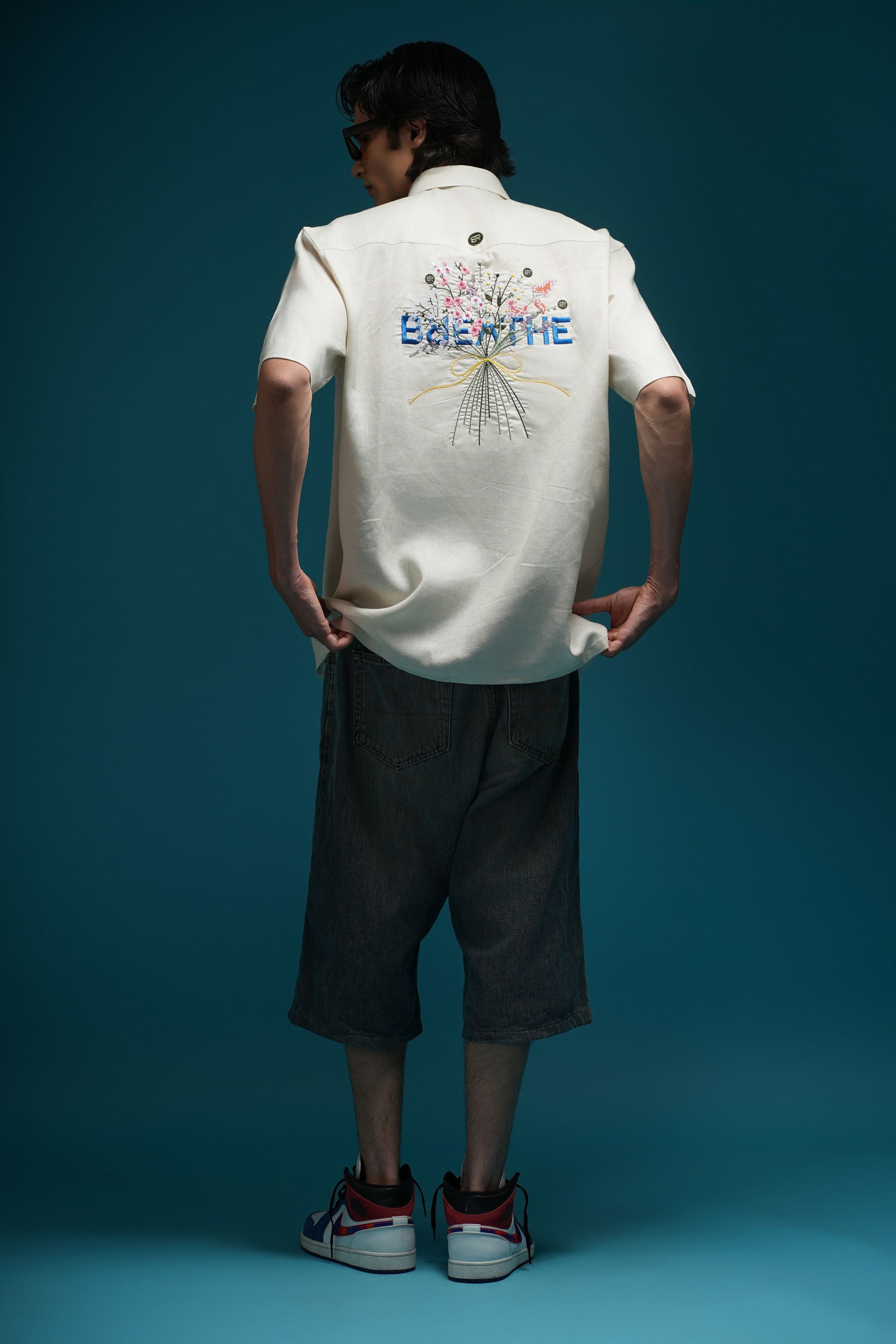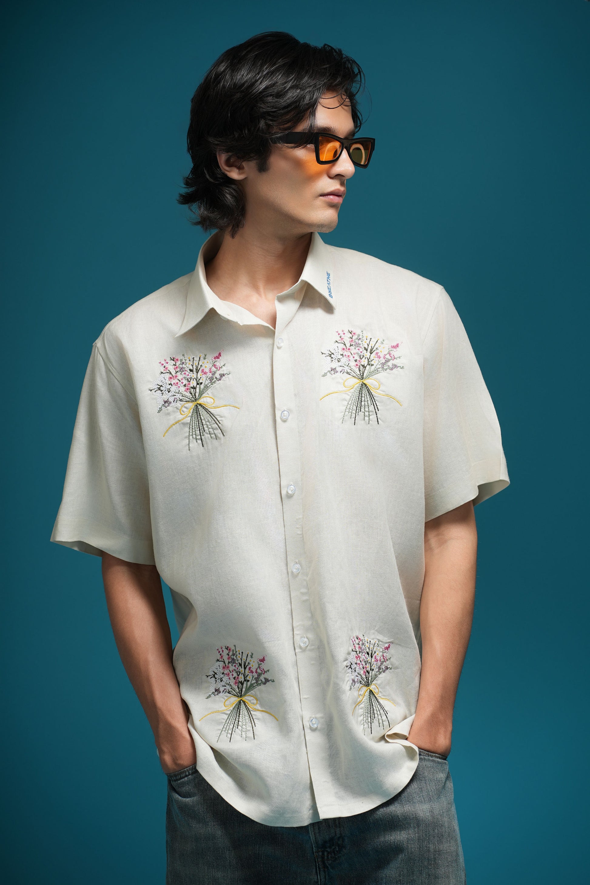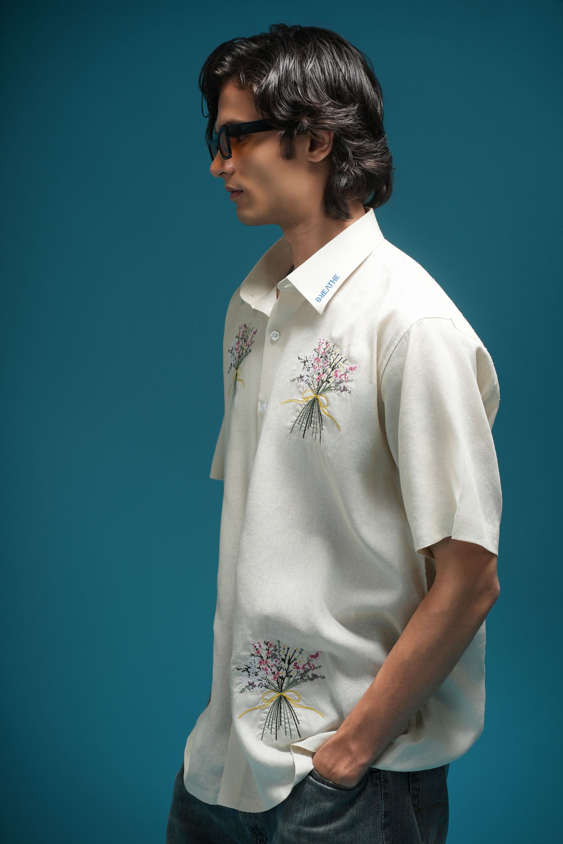 EXPERIENCE LUXURY WITH OUR "IVORY BOUQUET AFFAIR" EMBROIDERED PURE LINEN SHIRT. THE INTRICATE ARTWORK, BOASTING OVER MORE THAN 280,000 STITCHES, ELEVATES ITS EXCLUSIVITY AND SHOWCASES EXCEPTIONAL CRAFTSMANSHIP. CUT FROM 100% PURE LINEN AND FINISHED WITH A PREMIUM GARMENT WASH, THIS SHORT-SLEEVE SHIRT LANDS WITH THAT SOFT, BREATHABLE HAND FEEL ONLY GREAT LINEN DELIVERS. THE DRAPE IS RELAXED YET REFINED—EASY TO WEAR, INSTANTLY ELEVATED. FRONT PANELS CARRY FOUR DELICATE BOUQUET EMBROIDERIES, WHILE THE BACK FEATURES A LARGE, HIGH-DENSITY BOUQUET TIED WITH A RIBBON, LAYERED OVER THE BOLD BREATHE INSIGNIA. IT IS A COLLECTOR PIECE: EVERYDAY COMFORT, COUTURE-LEVEL DETAILING.