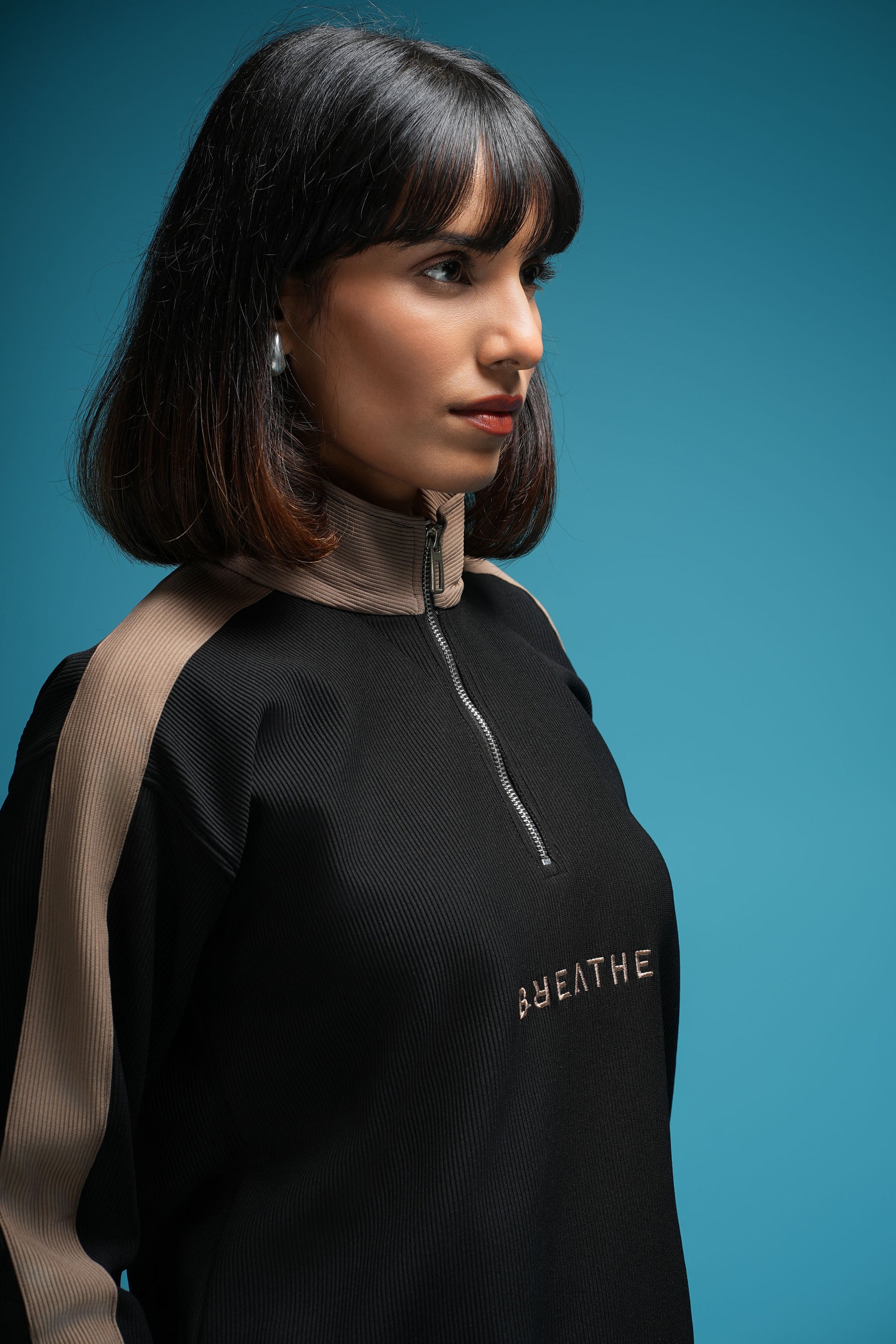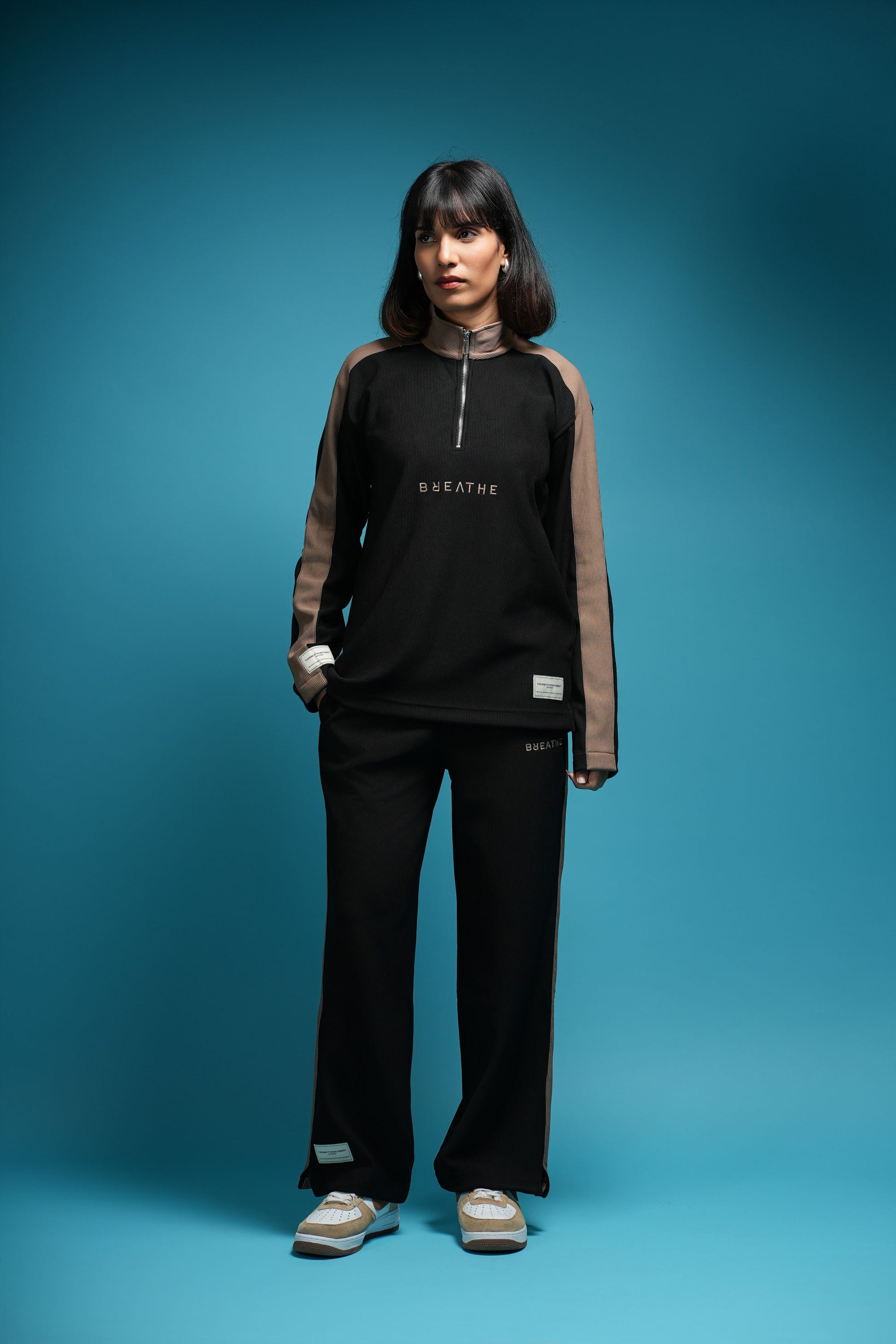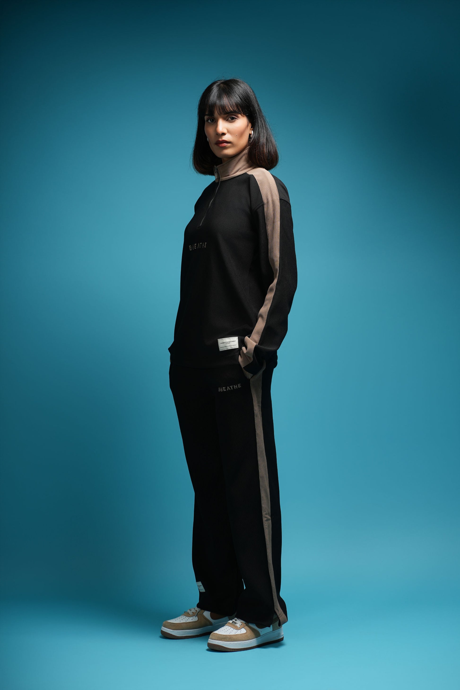 - ENGINEERED FOR THOSE WHO LIVE IN MOTION, THIS CORD SET BLENDS ELEVATED STREETWEAR WITH A TAILORED ATHLETIC EDGE. CRAFTED FROM A PREMIUM TEXTURED FABRIC, THE DEEP BLACK BASE IS CUT WITH PRECISION SAND PANELS THAT RUN ALONG THE SLEEVES AND SHOULDERS, CREATING A CLEAN YET DYNAMIC CONTRAST THAT ELONGATES THE FRAME AND ADDS INSTANT VISUAL RHYTHM. THE HALF-ZIP FUNNEL NECK GIVES THE TOP A VERSATILE, MODERN SILHOUETTE — WEAR IT ZIPPED FOR A SLEEK, STREAMLINED LOOK OR OPEN FOR RELAXED LAYERING. MINIMALIST BREATHE BRANDING ACROSS THE CHEST AND THIGH IS EXECUTED IN TONAL EMBROIDERY, KEEPING THE FOCUS ON FORM AND CONSTRUCTION WHILE HINTING AT UNDERSTATED LUXURY.
