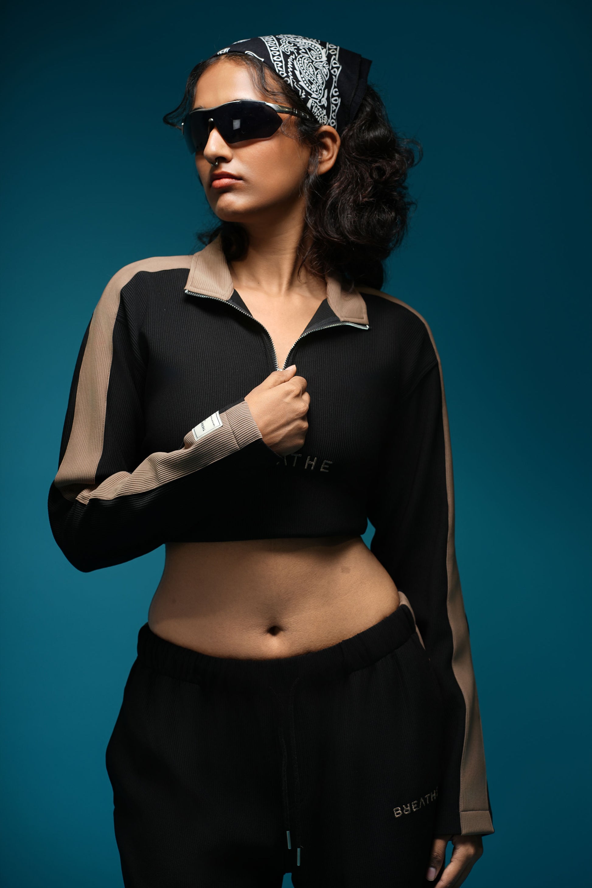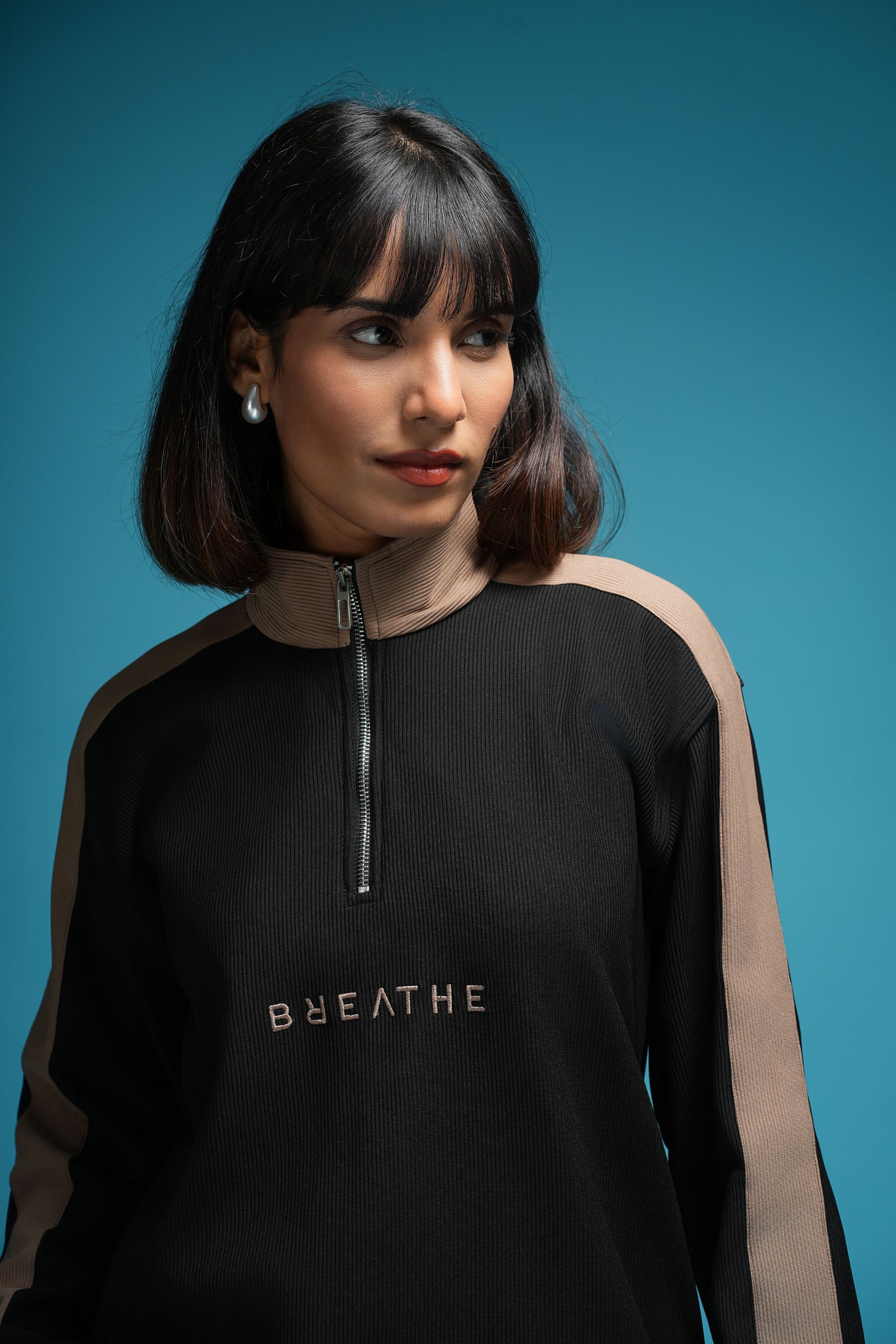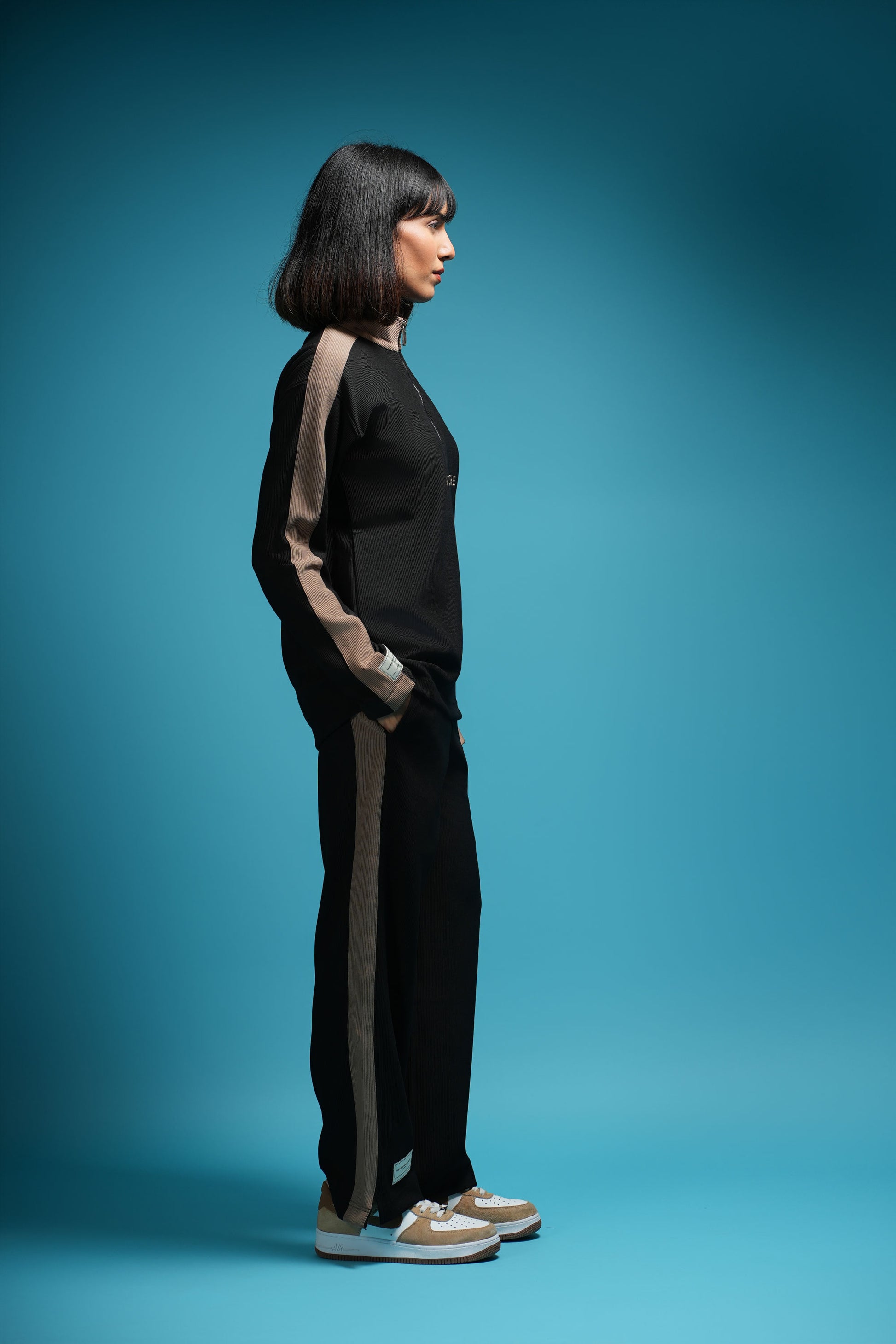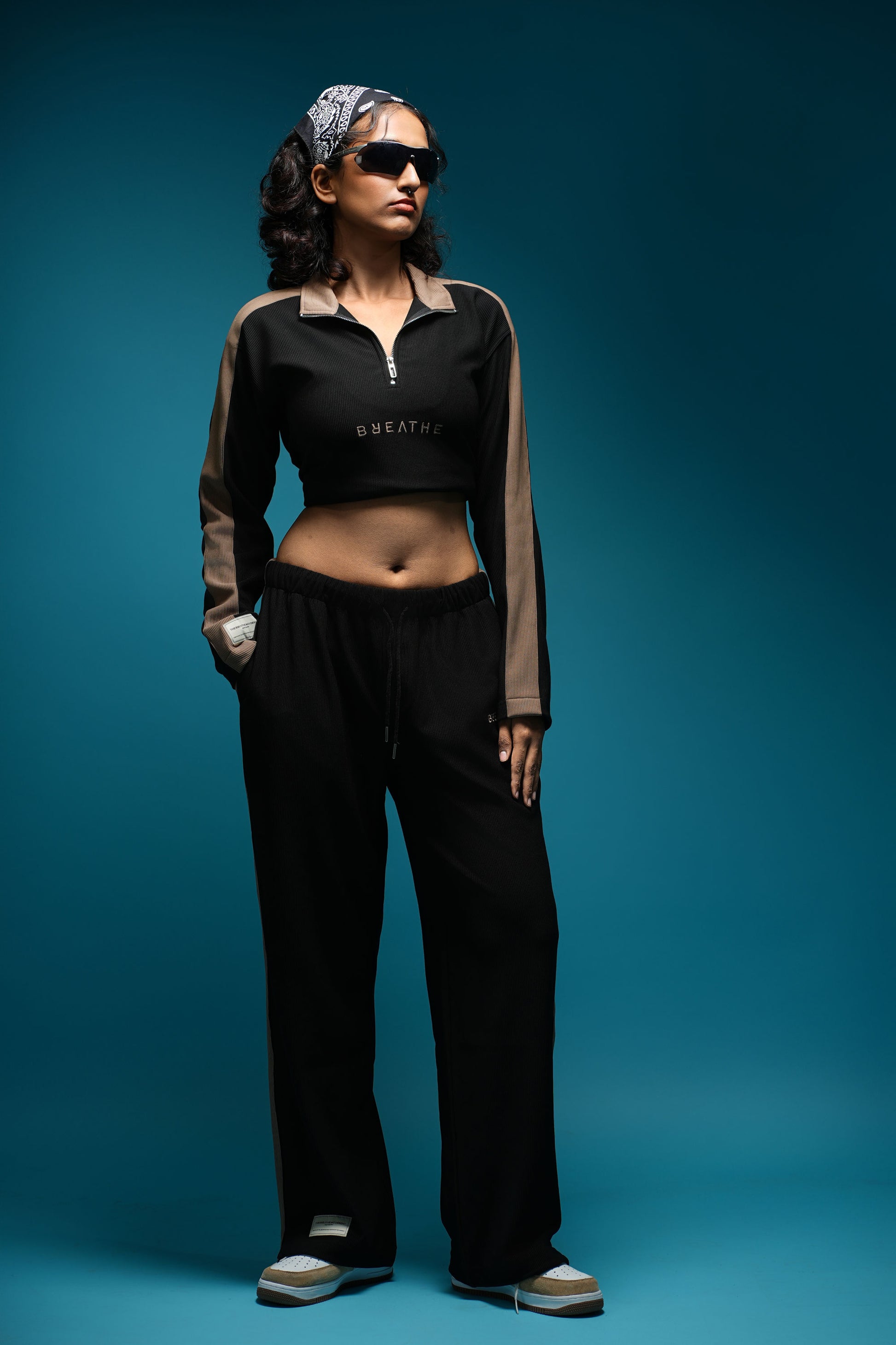 - ENGINEERED FOR THOSE WHO LIVE IN MOTION, THIS CORD SET BLENDS ELEVATED STREETWEAR WITH A TAILORED ATHLETIC EDGE. CRAFTED FROM A PREMIUM TEXTURED FABRIC, THE DEEP BLACK BASE IS CUT WITH PRECISION SAND PANELS THAT RUN ALONG THE SLEEVES AND SHOULDERS, CREATING A CLEAN YET DYNAMIC CONTRAST THAT ELONGATES THE FRAME AND ADDS INSTANT VISUAL RHYTHM. THE HALF-ZIP FUNNEL NECK GIVES THE TOP A VERSATILE, MODERN SILHOUETTE — WEAR IT ZIPPED FOR A SLEEK, STREAMLINED LOOK OR OPEN FOR RELAXED LAYERING. MINIMALIST BREATHE BRANDING ACROSS THE CHEST AND THIGH IS EXECUTED IN TONAL EMBROIDERY, KEEPING THE FOCUS ON FORM AND CONSTRUCTION WHILE HINTING AT UNDERSTATED LUXURY.