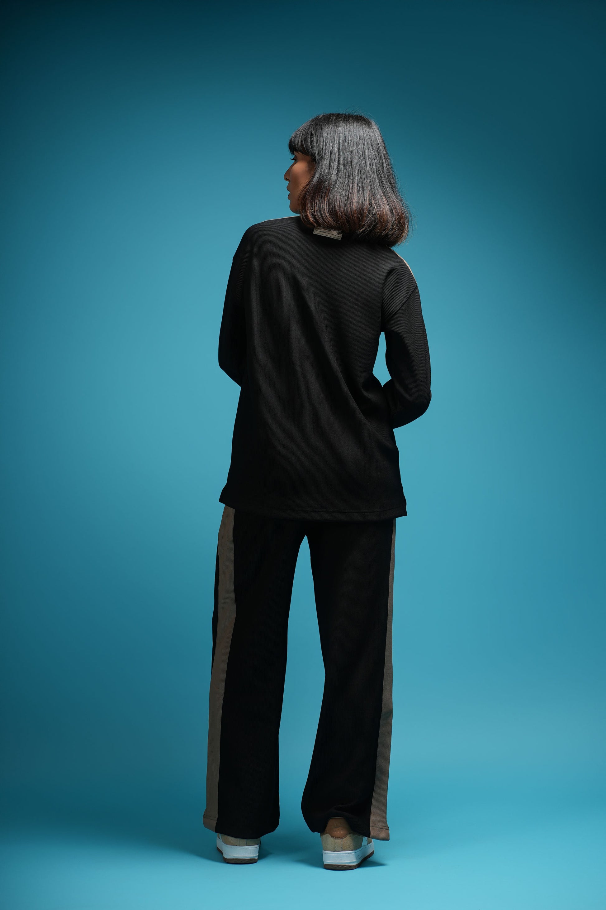 - THE MATCHING TROUSERS MIRROR THE TOP’S COLOUR-PLAY, MAINTAINING DESIGN CONTINUITY FOR A HEAD-TO-TOE STATEMENT. RELAXED YET REFINED, THIS SET MOVES SEAMLESSLY FROM STREET TO LOUNGE, FROM FIRST CLASS TRAVEL TO SOCIAL SCENES, WITH A FIT THAT FLATTERS WITHOUT RESTRICTING.
