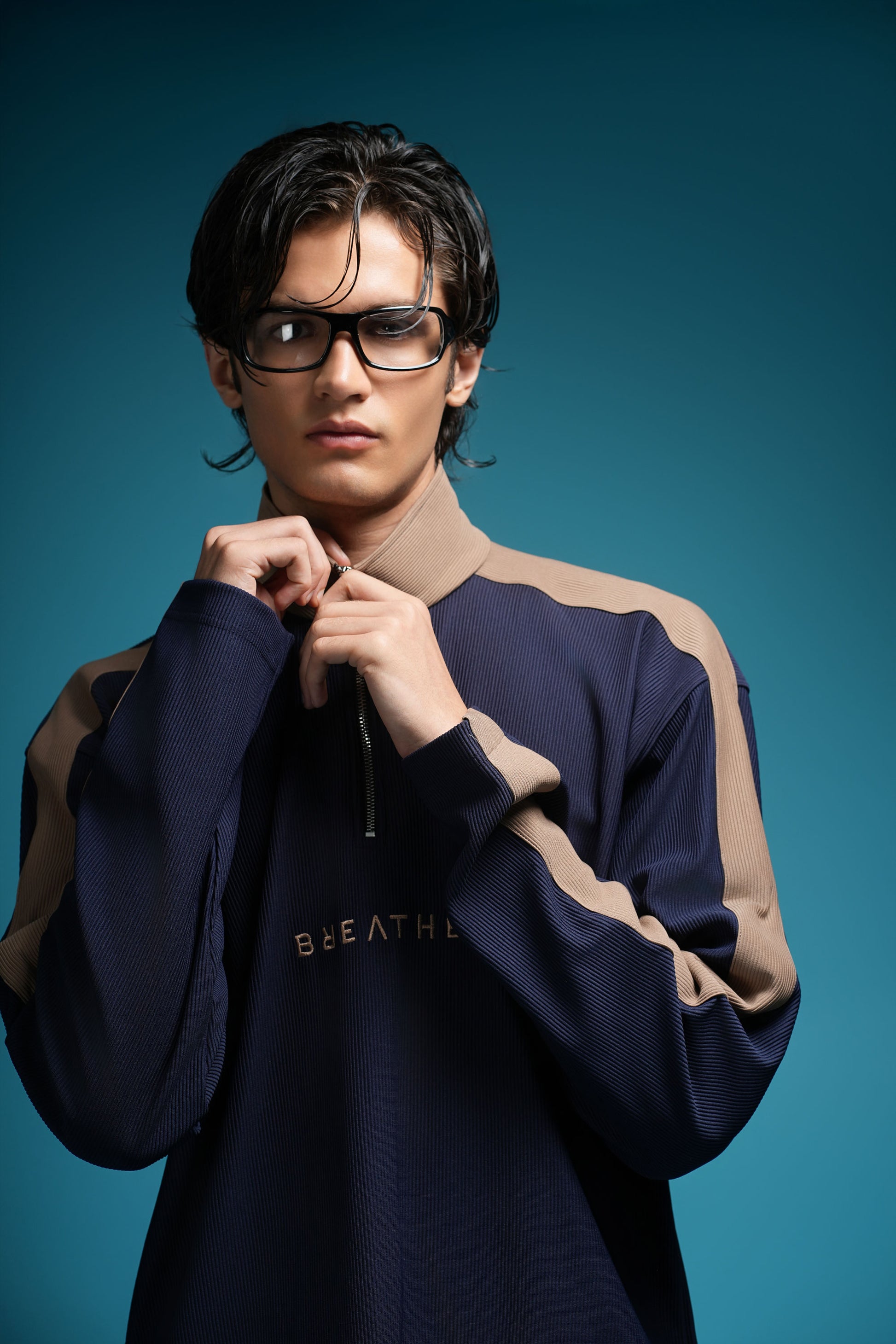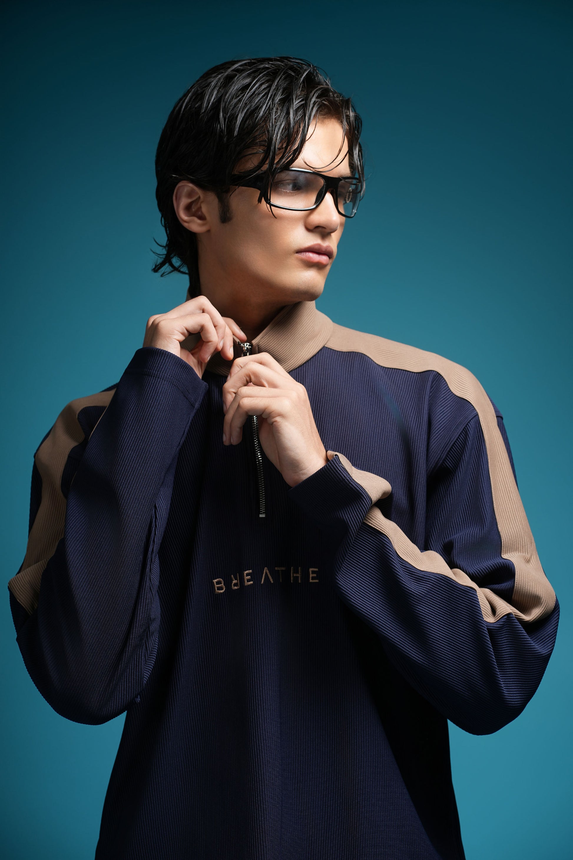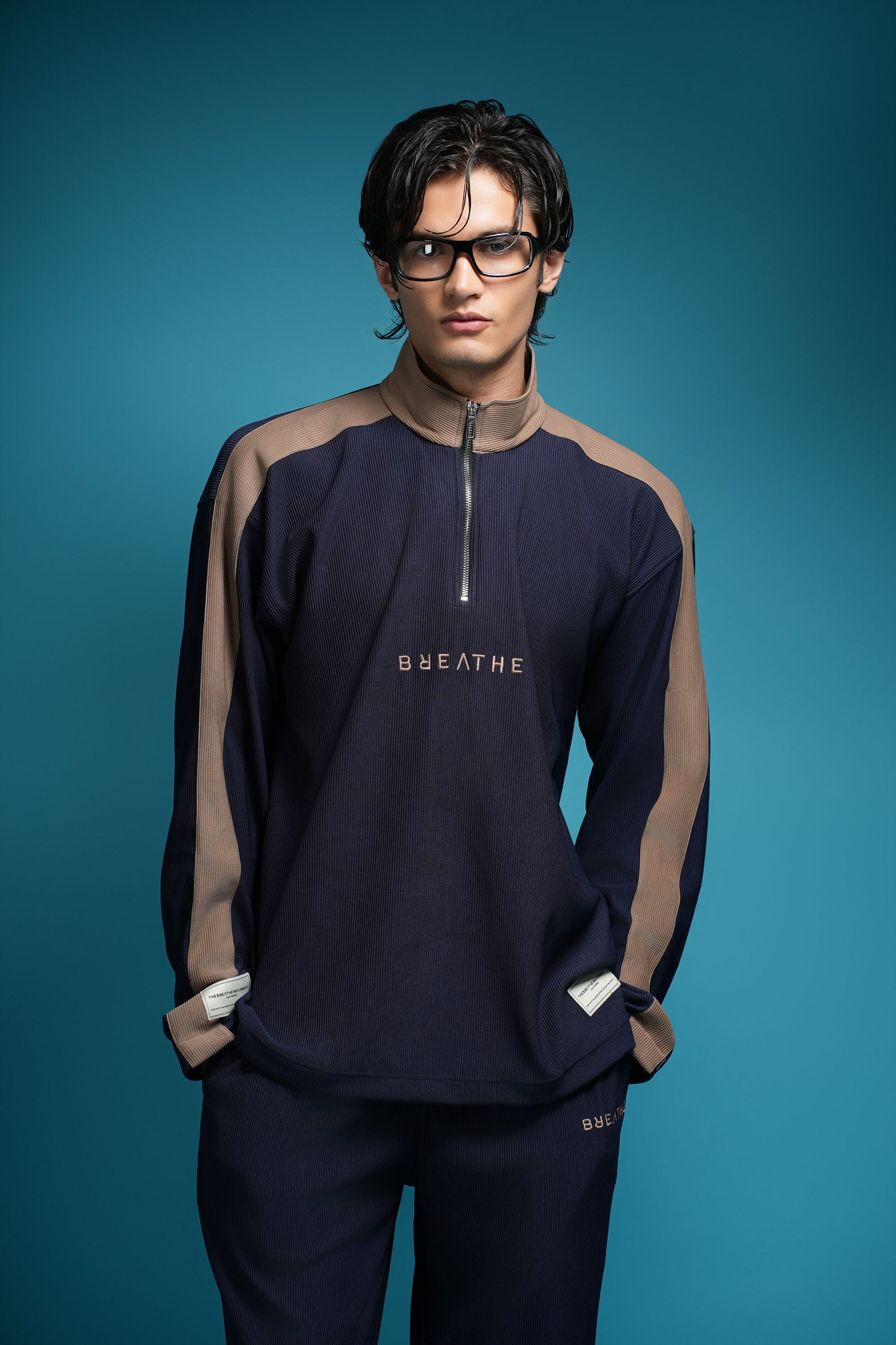 - ENGINEERED FOR THOSE WHO LIVE IN MOTION, THIS CORD SET BLENDS ELEVATED STREETWEAR WITH A TAILORED ATHLETIC EDGE. CRAFTED FROM A PREMIUM TEXTURED FABRIC, THE DEEP NAVY BASE IS CUT WITH PRECISION SAND PANELS THAT RUN ALONG THE SLEEVES AND SHOULDERS, CREATING A CLEAN YET DYNAMIC CONTRAST THAT ELONGATES THE FRAME AND ADDS INSTANT VISUAL RHYTHM. THE HALF-ZIP FUNNEL NECK GIVES THE TOP A VERSATILE, MODERN SILHOUETTE — WEAR IT ZIPPED FOR A SLEEK, STREAMLINED LOOK OR OPEN FOR RELAXED LAYERING. MINIMALIST BREATHE BRANDING ACROSS THE CHEST AND THIGH IS EXECUTED IN TONAL EMBROIDERY, KEEPING THE FOCUS ON FORM AND CONSTRUCTION WHILE HINTING AT UNDERSTATED LUXURY.