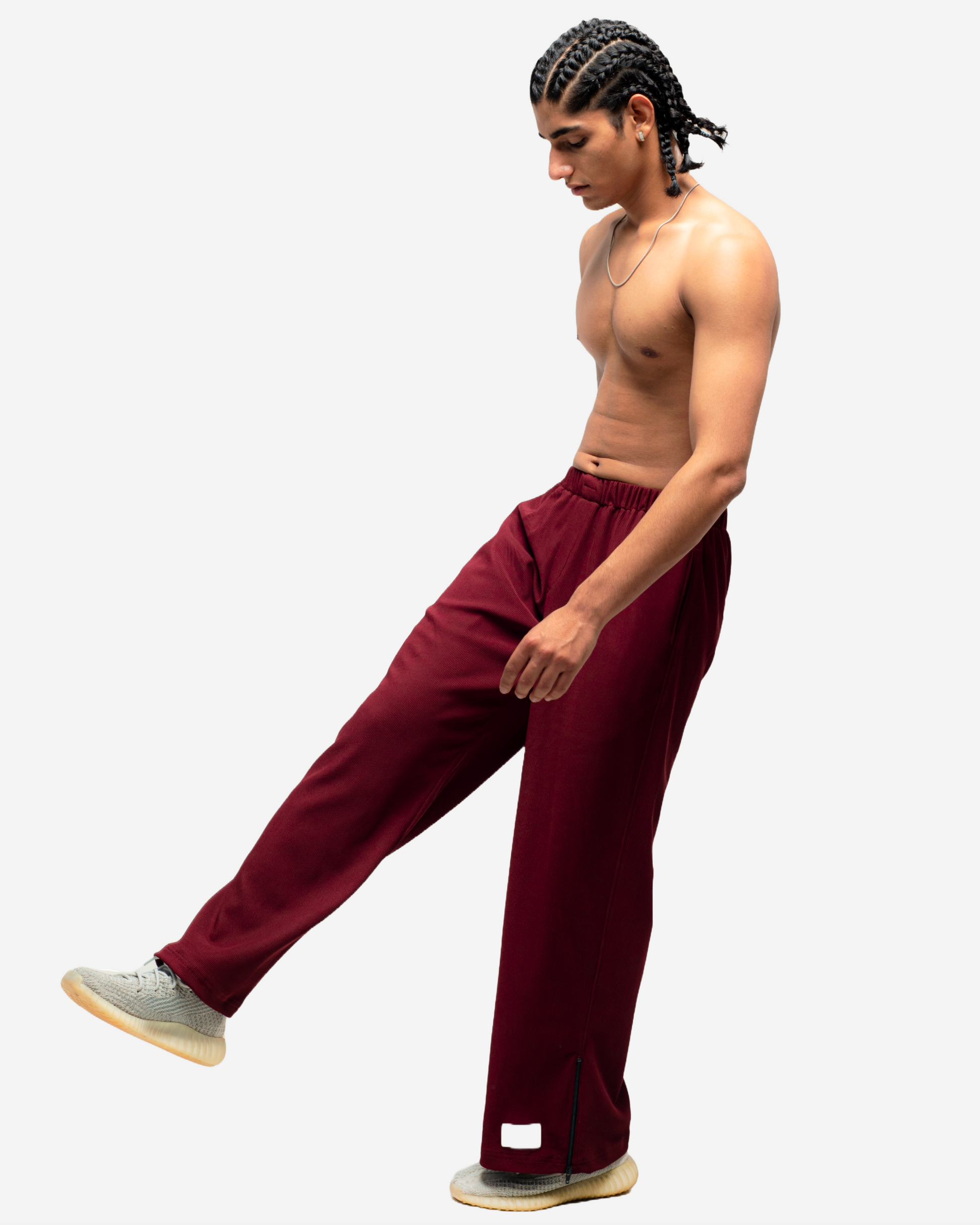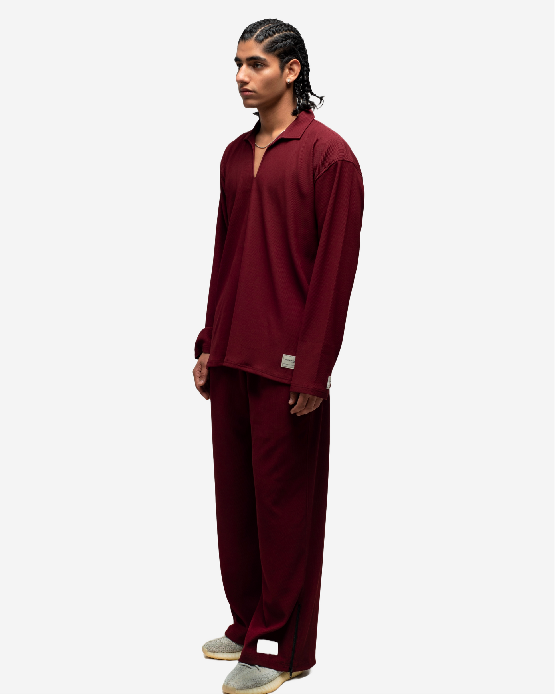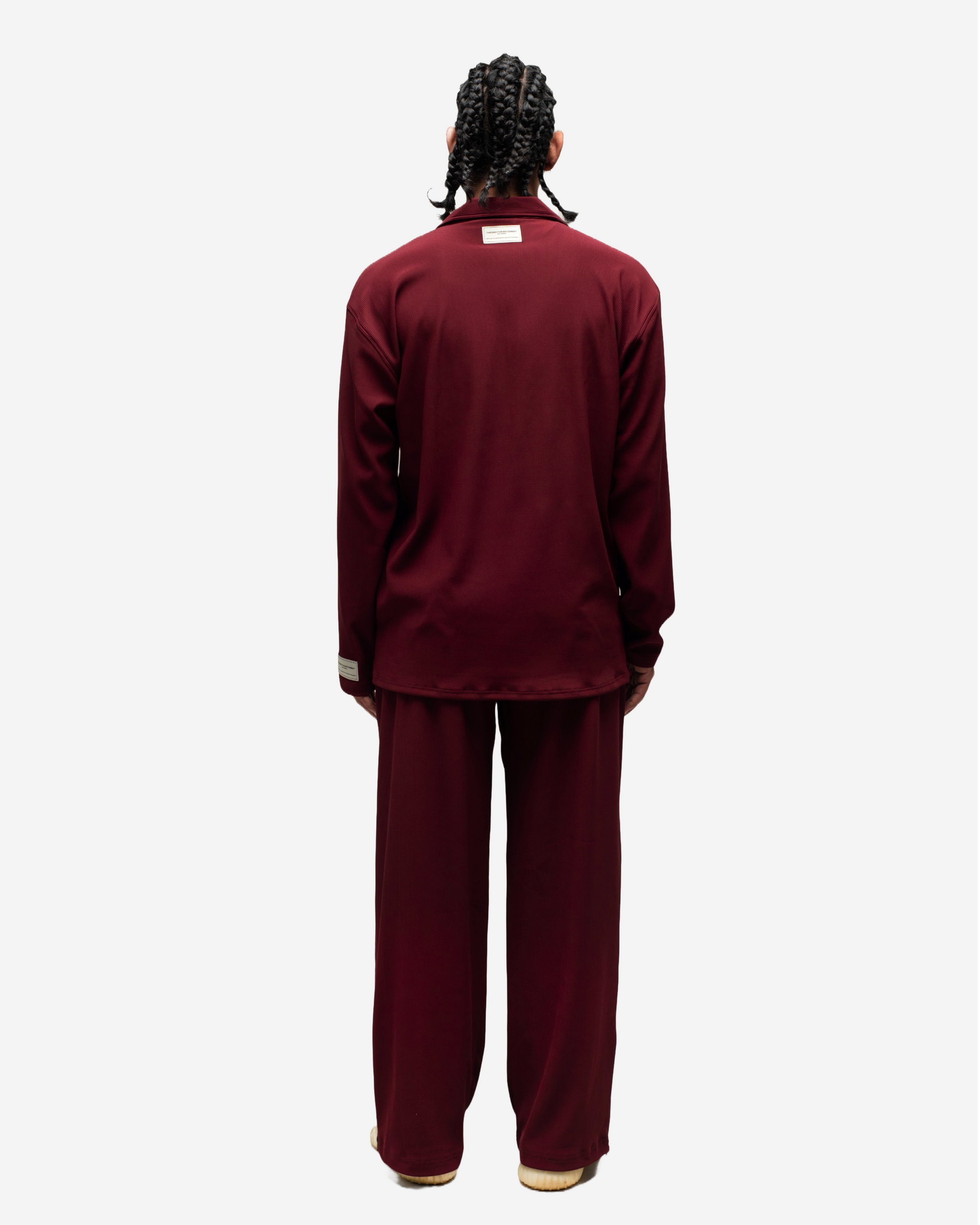 INSPIRED BY THE EXAGGERATED BOXY CUT OF 90s OUT OF THE BOX YET SUBTLE SILHOUETTE, WARM- UP DRILL TOPS & STRAIGHT LEG DRILL SWEATPANTS WHICH CAN BE FOUND IN SPORTING ERAS GONE BY. OUR NEW CUSTOM IN HOUSE DEVELOPED FABRIC FROM IMPORTED CORD LYCRA YARN, IT IS LIKE NOTHING WE’VE EVER FELT BEFORE. THIS IS INDEED THE MOST COMFY, BAGGY, AND GO TO RESORT AND AIRPORT LOOK. THIS OVERSIZED DARK MAROON PANTS & TOP IS FINISHED WITH OUR “THEBꓤEATHEMOVEMENT” LABEL.