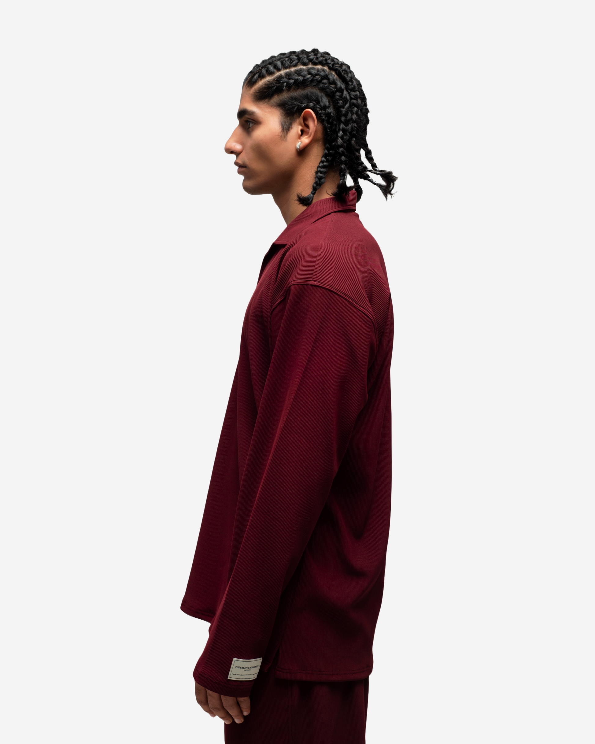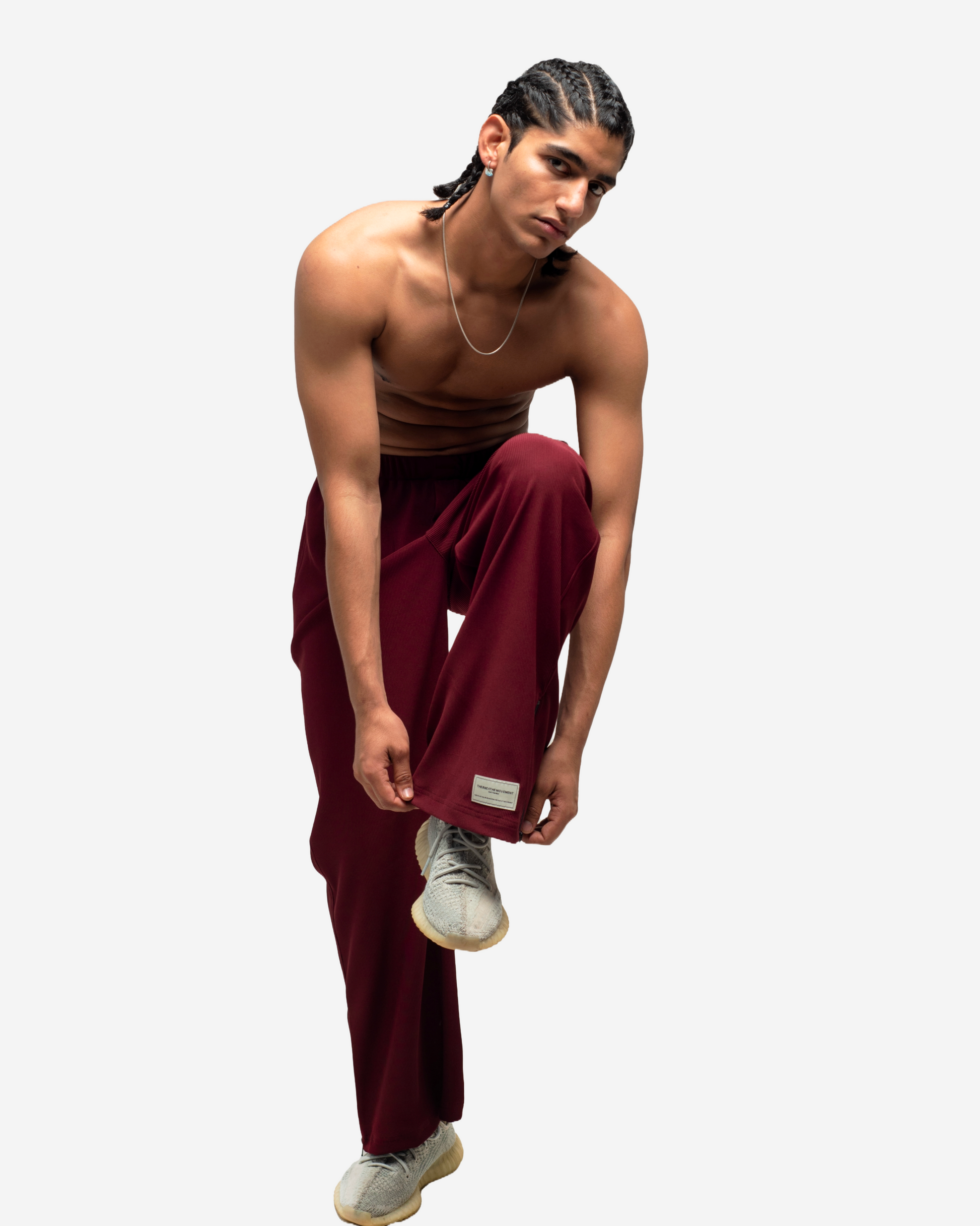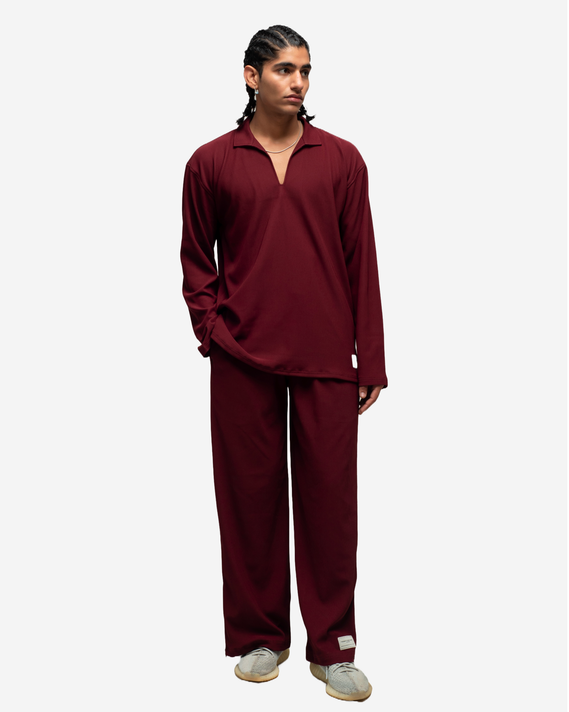 INSPIRED BY THE EXAGGERATED BOXY CUT OF 90s OUT OF THE BOX YET SUBTLE SILHOUETTE, WARM- UP DRILL TOPS & STRAIGHT LEG DRILL SWEATPANTS WHICH CAN BE FOUND IN SPORTING ERAS GONE BY. OUR NEW CUSTOM IN HOUSE DEVELOPED FABRIC FROM IMPORTED CORD LYCRA YARN, IT IS LIKE NOTHING WE’VE EVER FELT BEFORE. THIS IS INDEED THE MOST COMFY, BAGGY, AND GO TO RESORT AND AIRPORT LOOK. THIS OVERSIZED DARK MAROON PANTS & TOP IS FINISHED WITH OUR “THEBꓤEATHEMOVEMENT” LABEL.
