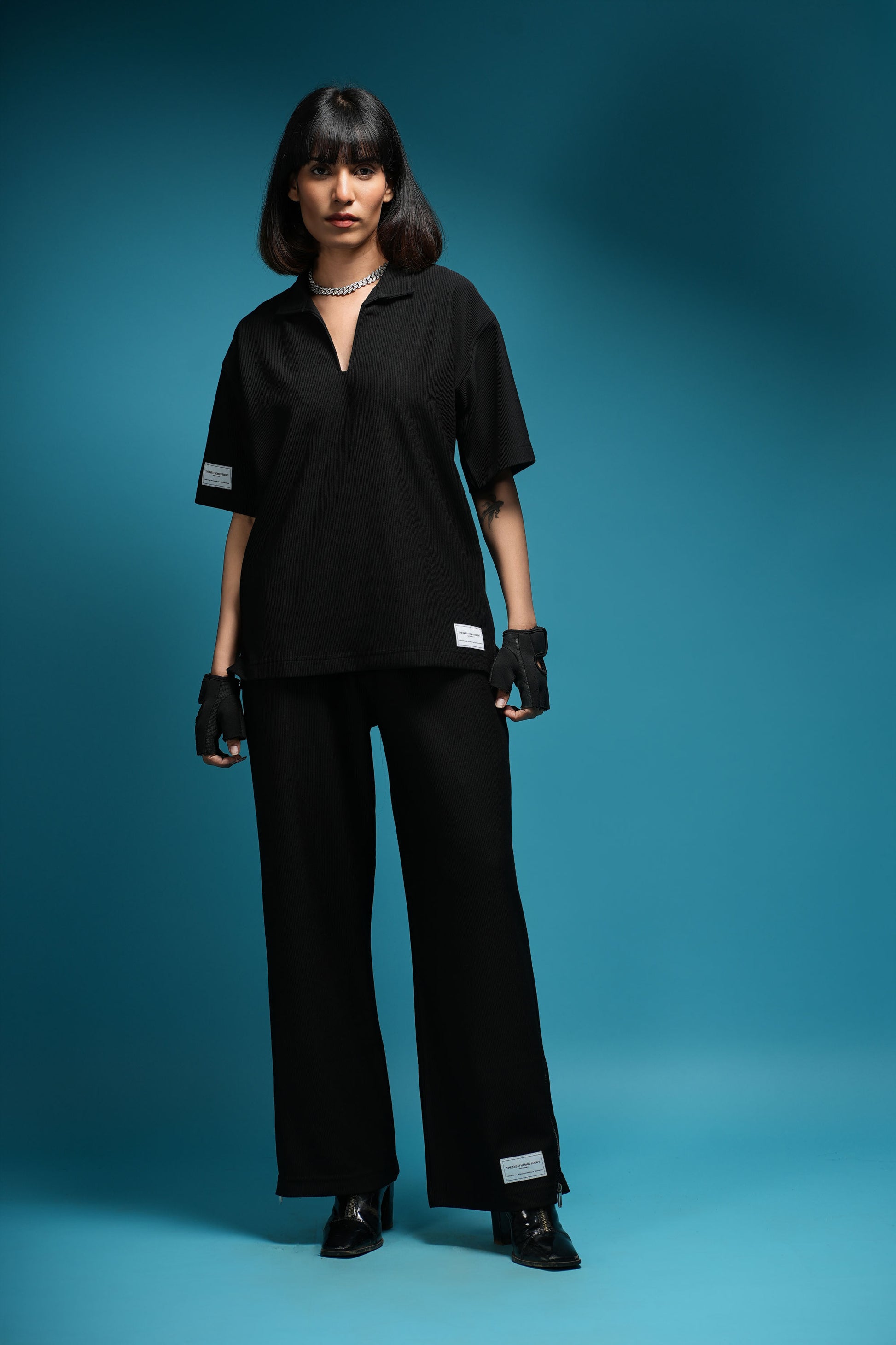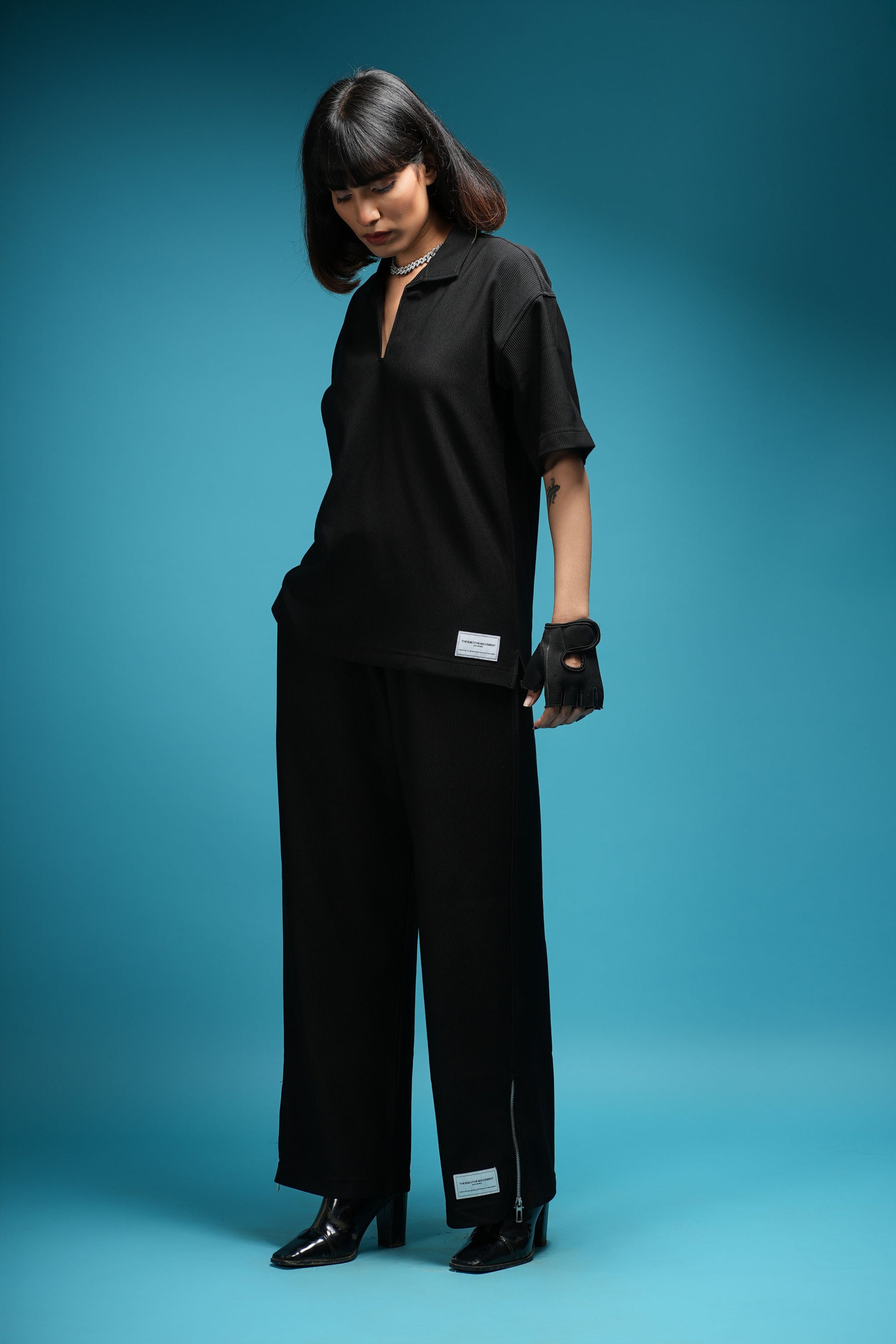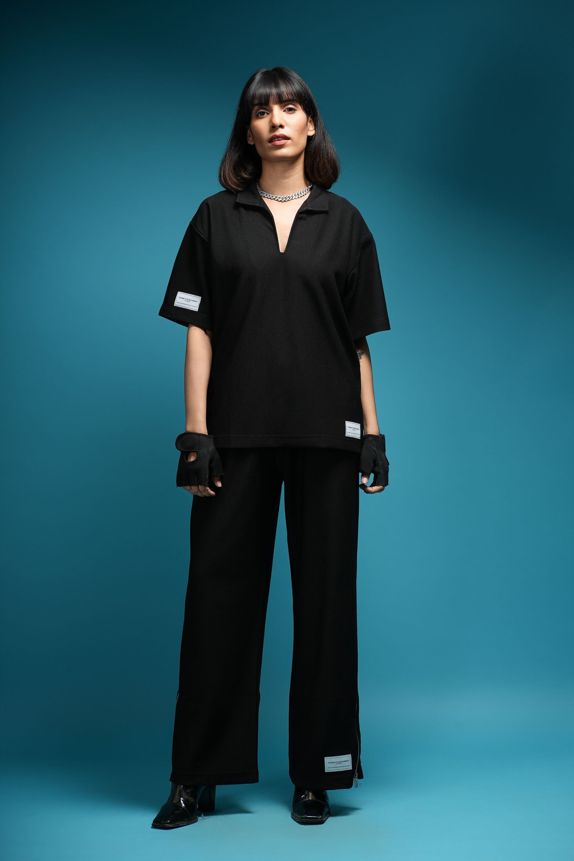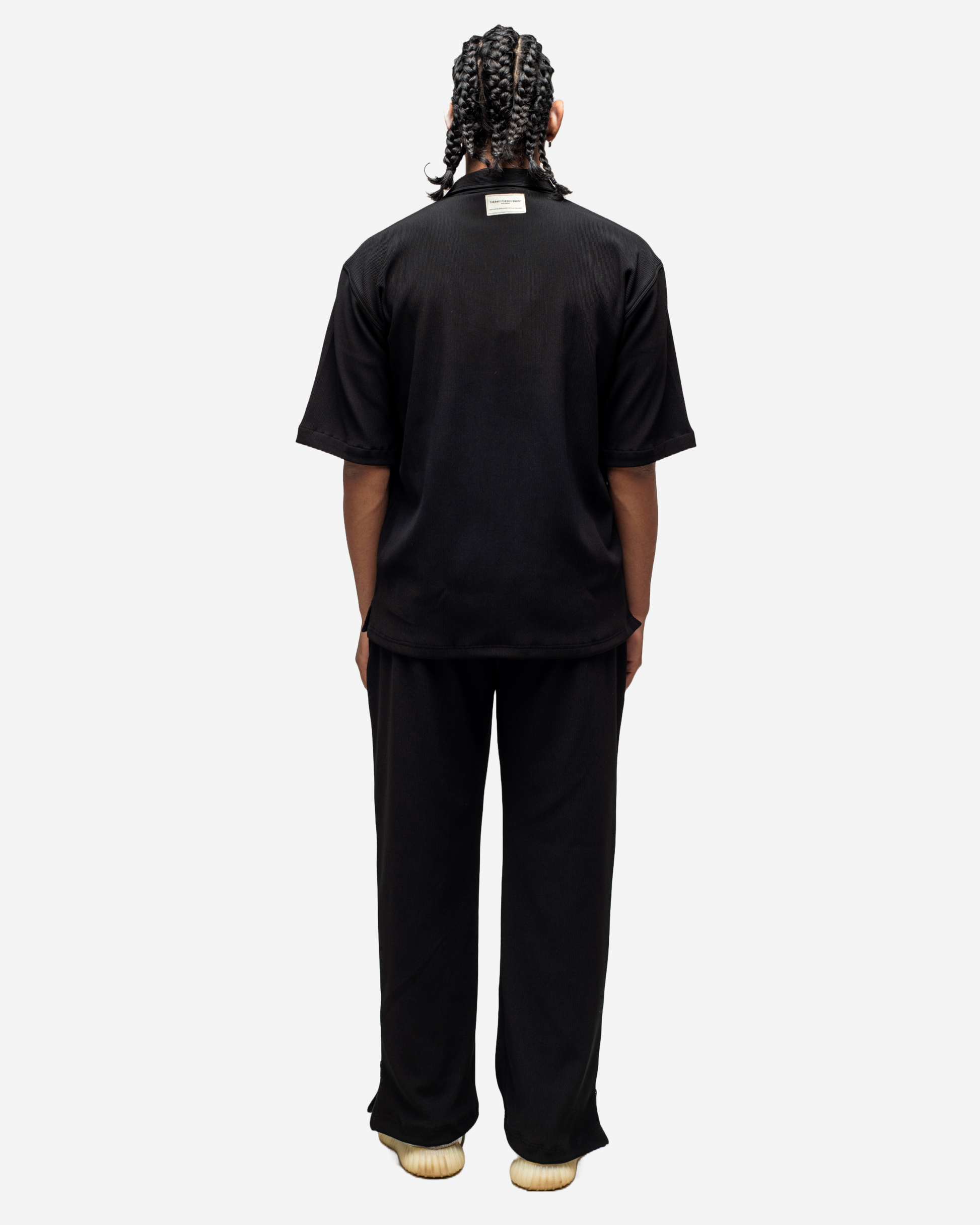 DESIGNED FOR THE MODERN ELITE, THE TBM CORD SET IN DARK BLACK IS YOUR GO-TO FOR FIRST-CLASS TRAVEL, LUXURY GETAWAYS, AND SPORT-LUXE MOMENTS — FROM PRIVATE JETS AND COASTAL GOLF CLUBS TO PADDLE COURTS IN THE SOUTH OF FRANCE. TAILORED IN OUR CUSTOM-DEVELOPED CORD LYCRA FABRIC, USING IMPORTED PREMIUM YARN FROM JAPAN, IT OFFERS UNMATCHED COMFORT, SOFTNESS, STRETCH, AND REFINED STRUCTURE. THE 90S-INSPIRED BOXY TOP AND WIDE-LEG SILHOUETTE EXUDE RELAXED OPULENCE, MAKING IT THE PERFECT STATEMENT FOR THOSE WHO LIVE AND MOVE BOLDLY. FINISHED WITH OUR ICONIC THEBREATHEMOVEMENT LABEL, THIS SET ISN’T JUST WORN — IT’S EXPERIENCED.